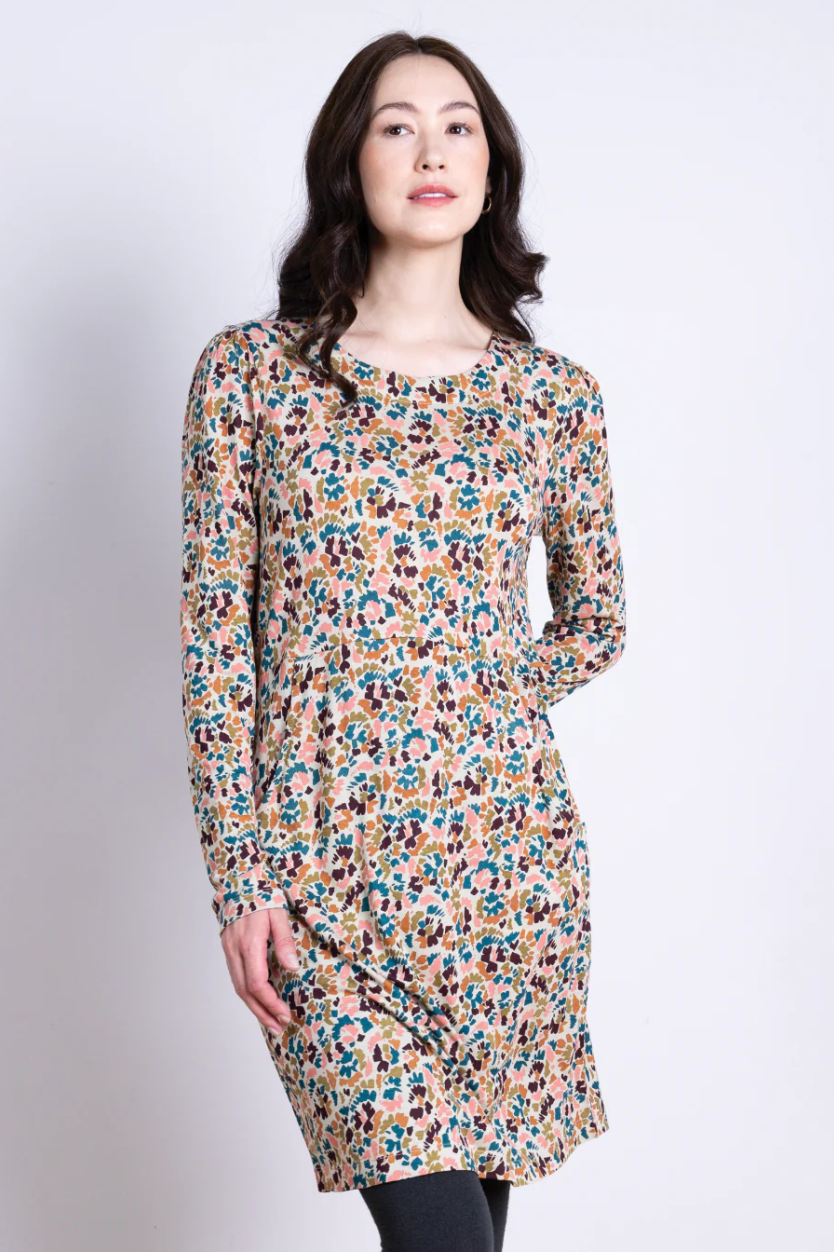 this week our leafies are loving...this comfy, casual dress from Nomads. with burgundy, pink & blue accent tones, it has pockets and a relaxed fit. Wear with tights as the weather cools.