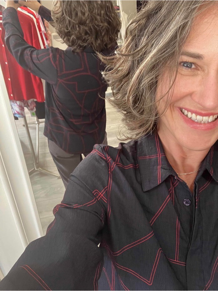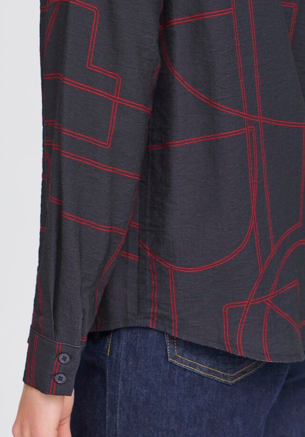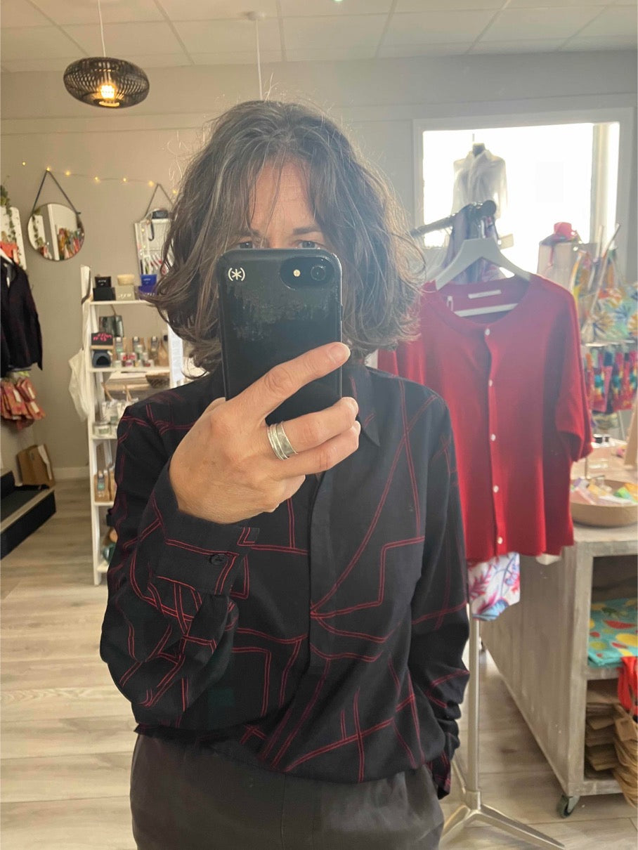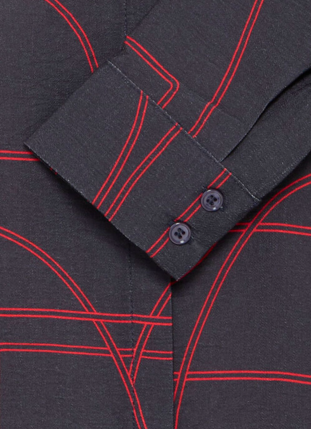 This viscose blouse works well casual or dressy. With navy and red geometric pattern design. Length is regular and sizing is slightly generous so if you are between sizes, then size down.