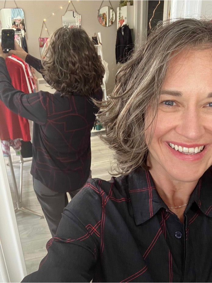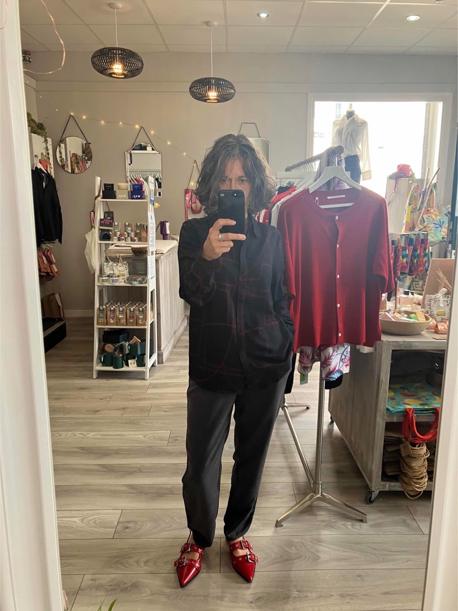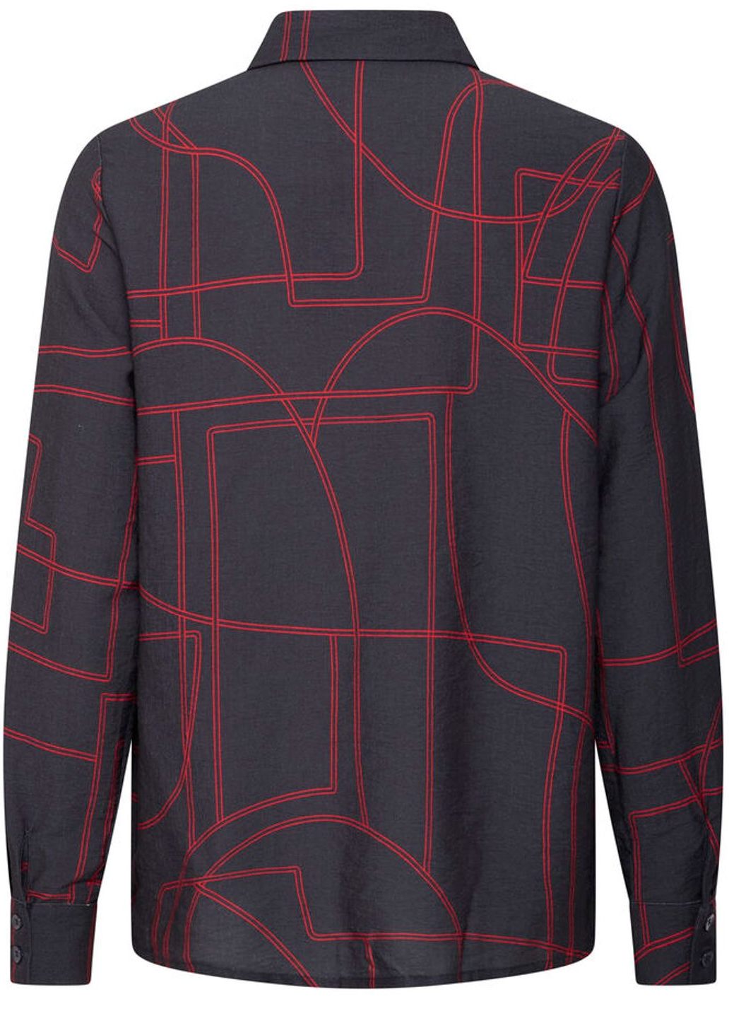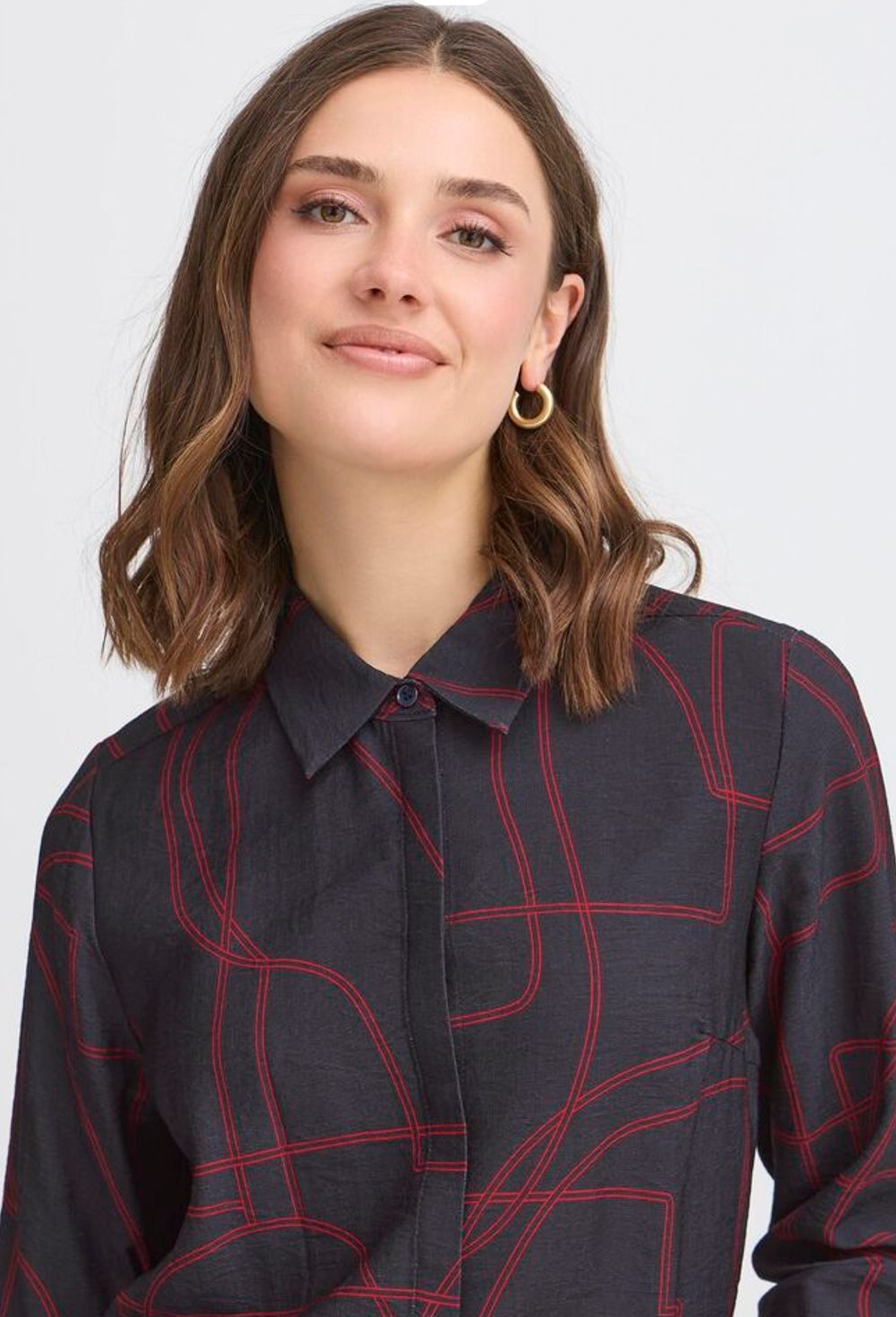 This viscose blouse works well casual or dressy. With navy and red geometric pattern design. Length is regular and sizing is slightly generous so if you are between sizes, then size down.