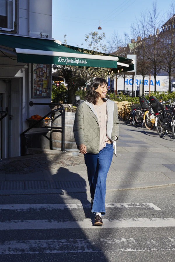 The soft sage tone on the outer jacket is complimented by a grey colour underneath. It looks like two separate pieces but the two elements only double up across the chest. The grey hood creates a layering effect.