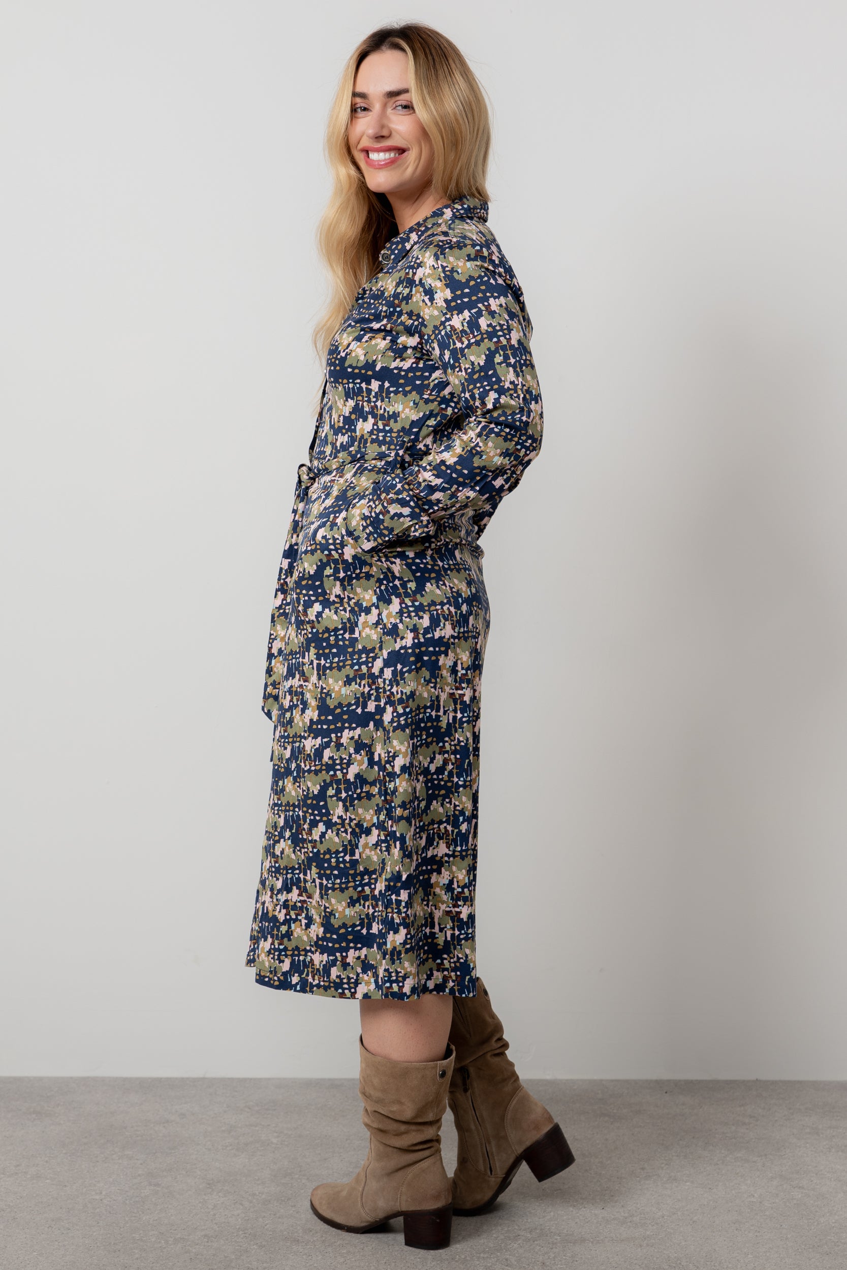This beautiful print of blues, greens and dusky pink comes in at midi length with a long sleeve and shirt collar. With a relaxed fit, it is works well with bare legs for early autumn or tights and boots later in the season. Super comfy to wear, an excellent buy this season.