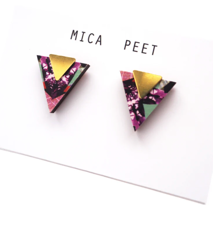 Stunning & unique geometric stud earrings, featuring Mica's own print design, combined with a brass triangle