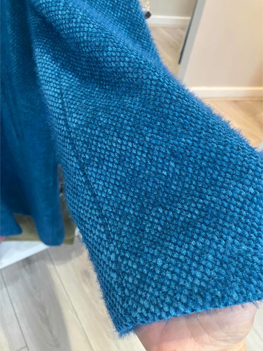 This coat is super soft to the touch and comes in a beautiful bright blue. With collar and two large buttons at the close, it has side pockets and is fully lined. Wear on a night out or everyday, this coat is a real treat and will last for years.