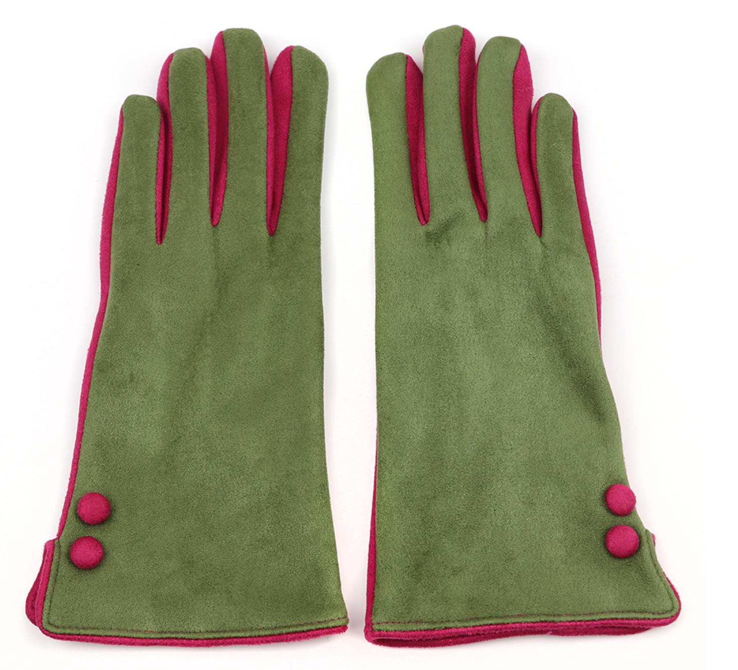 Olive green and fuchsia contrast faux suede gloves with button cuffs