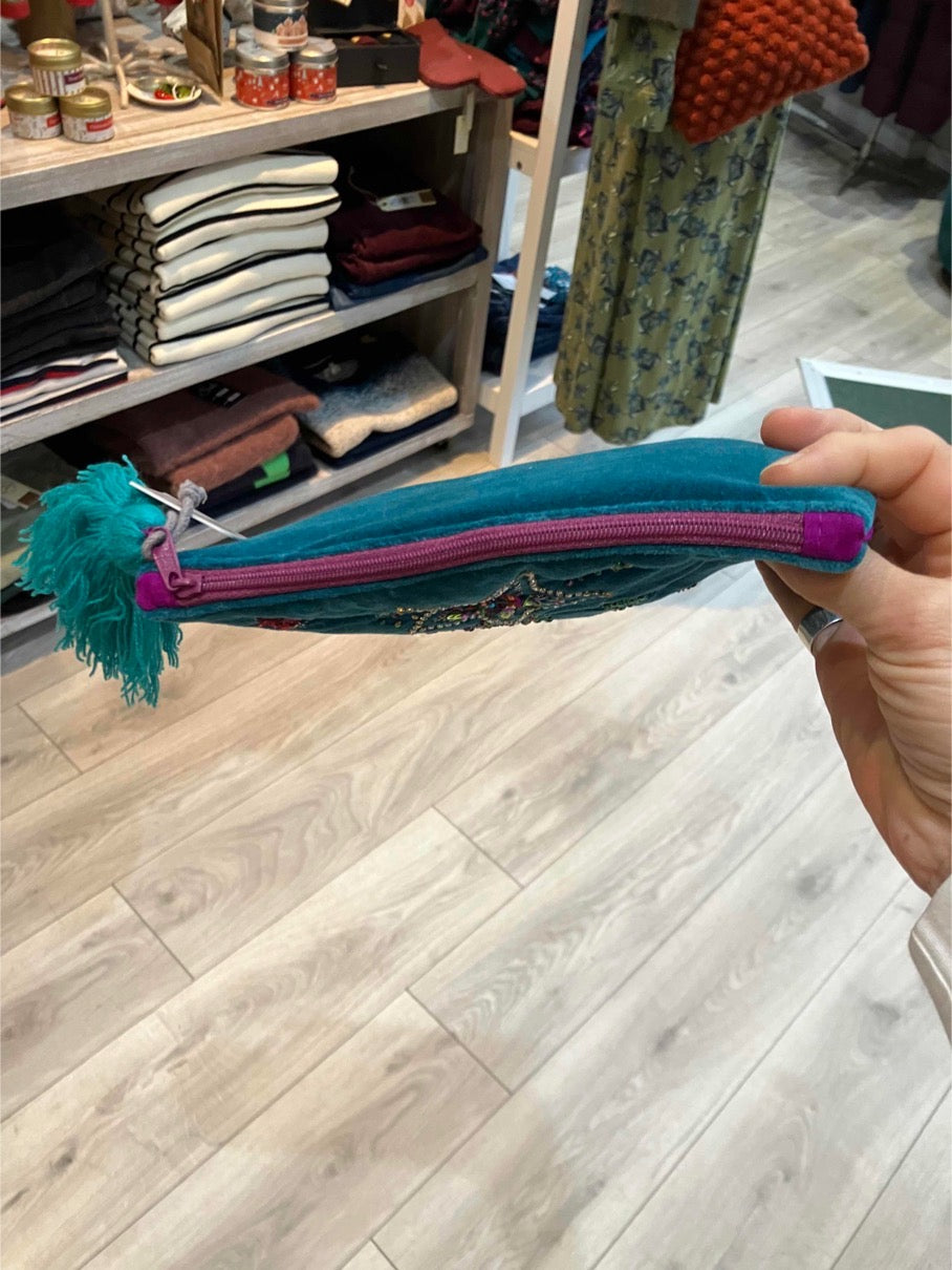 Teal velvet cosmetic purse with shooting stars embellishments.