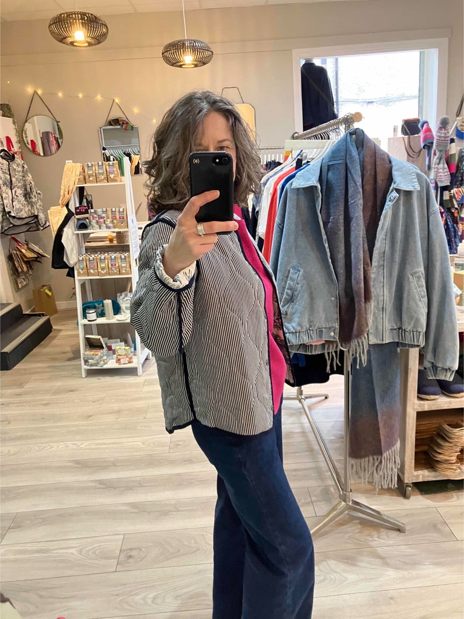 with floral navy and ecru pattern on one side and striped pattern on the other, this is a shrewd buy.