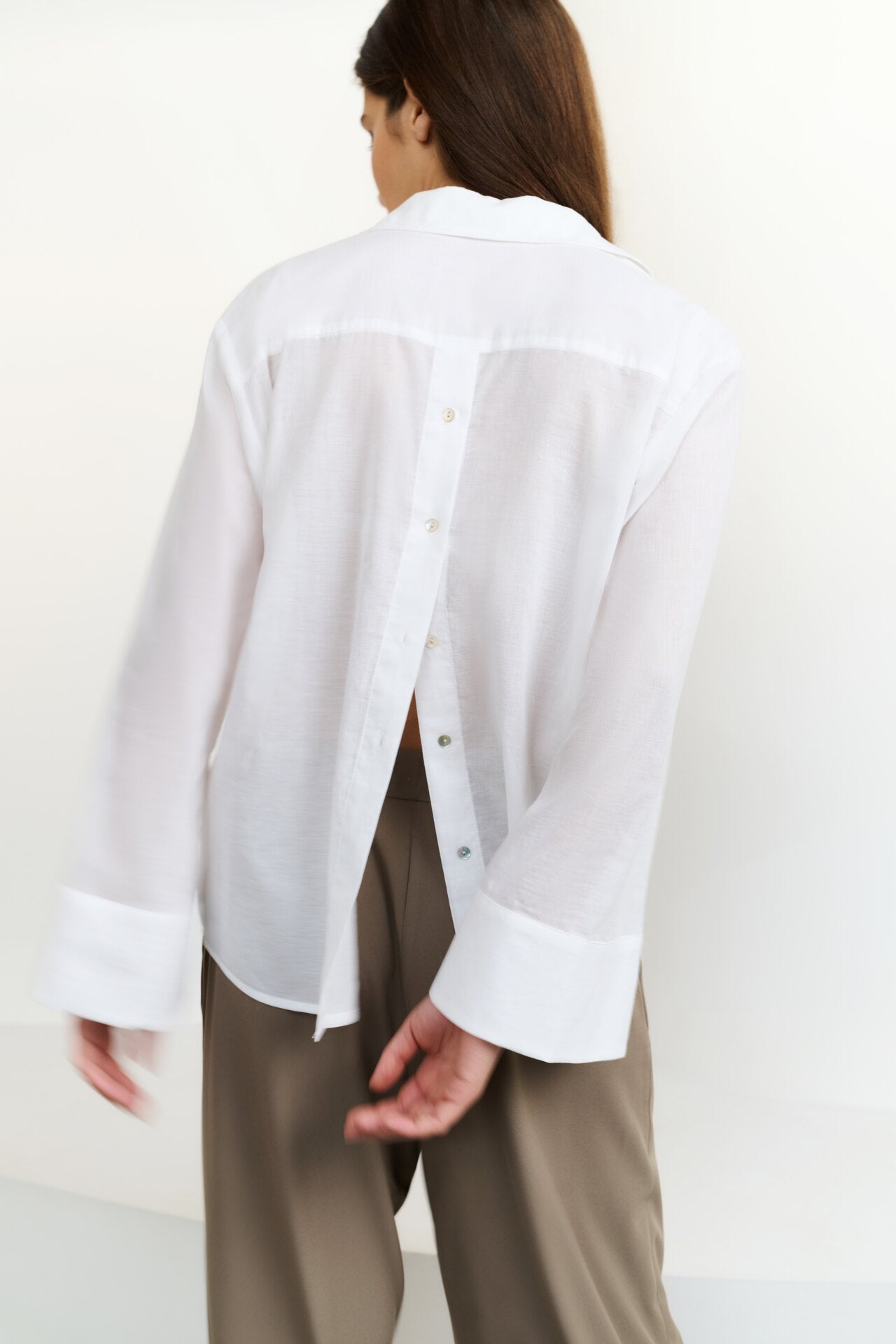 Classy, staple blouse in off white with button detail down the back and wide sleeves & cuffs.